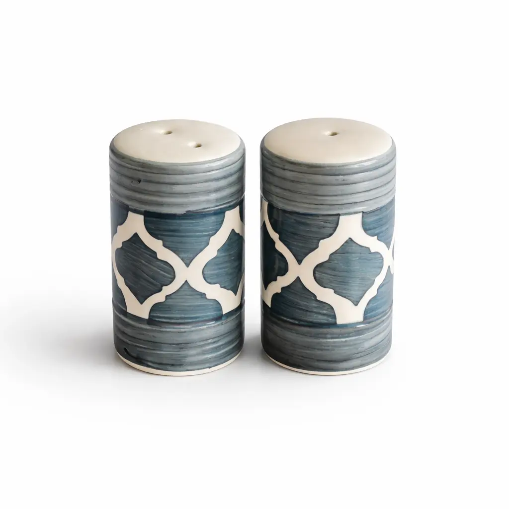 This ceramic salt and pepper shakers set features a unique Moroccan-inspired quatrefoil pattern that adds a sophisticated and artistic touch to your dining table. The brushed grey-blue finish combined with an off-white geometric design creates a premium and timeless look that complements a wide range of kitchen styles.