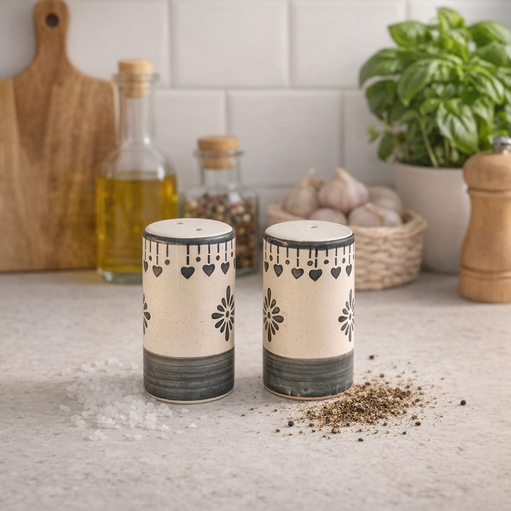 Elegant handmade ceramic salt & pepper shaker set with ivory floral design. Durable, easy to clean, and perfect for everyday dining or kitchen décor.